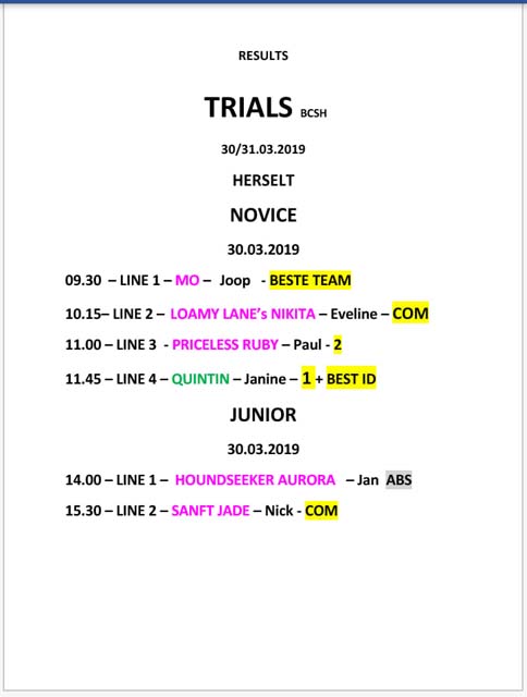 | Trials Kasterlee - 05/03/2016: Judge: Jan Grit: working permit + novice Judge: Chantal Van Raemdonck: junior + senior Novice: Harvidene Shiraz - C. Van Raemdonck Junior: Clearwater's Xciting Moonstone (Bert) - J. Grit Senior: Ike of Robert's Choice - R. De Messemaeker |