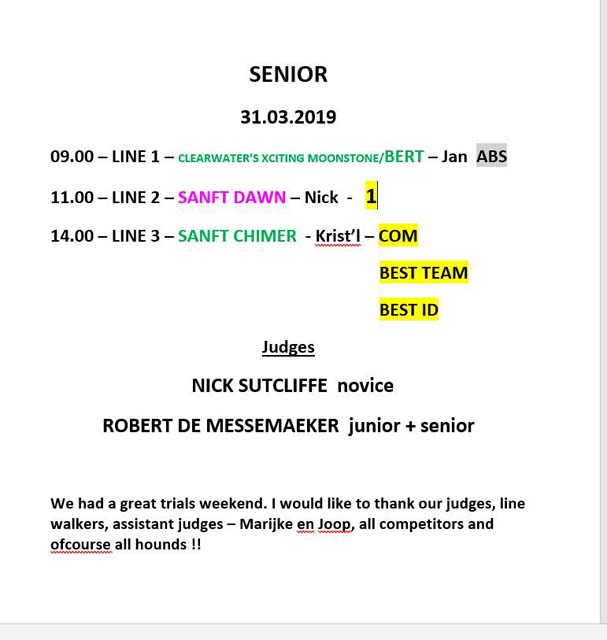 | Trials Westerlo (BE) - 14 & 15/03/2015: Novice stake: ![]() Marguareth de la Meute d'Antan: 1ste prijs Sanft Chimer: identificatieprijs Junior stake: ![]() Sanft Daylight: 1ste prijs ![]() |
